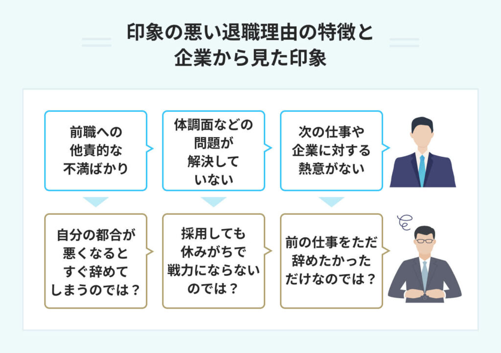 転職面接で退職理由を聞かれた際、前向きな表現を用いることが重要です。たとえば、「新しいチャレンジを求めたかった」や「キャリアアップを目指したかった」といった理由は、ポジティブな印象を与えるでしょう。逆に、前職の会社や上司に対する不満や悪口は、避けるべきです。ネガティブな内容は、聞き手に不快感を与える可能性があり、面接官にマイナスの印象を与える恐れがあります。
