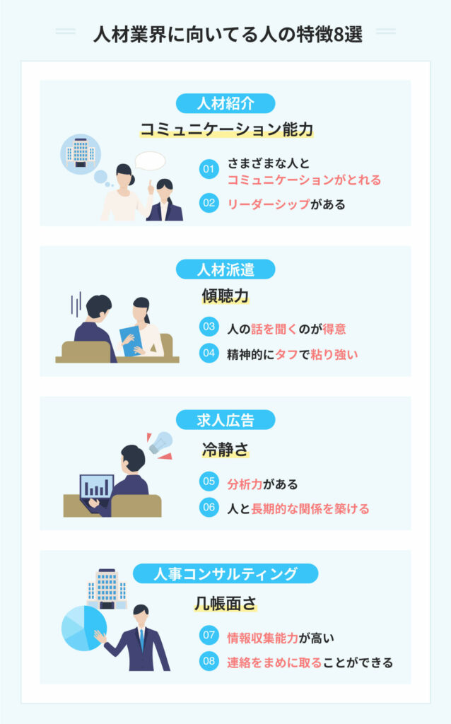 人材業界で働く人には、コミュニケーション能力やエモーショナルインテリジェンスが求められます。クライアントや求職者との関係を築くために、コミュニケーション能力が高く、人を理解し支えることができる人が適しています。また、ビジネスに対する深い理解と戦略的な思考も必要です。企業のニーズを理解し、適切な人材をマッチングさせるために、ビジネスの知識と戦略的な思考が求められます。