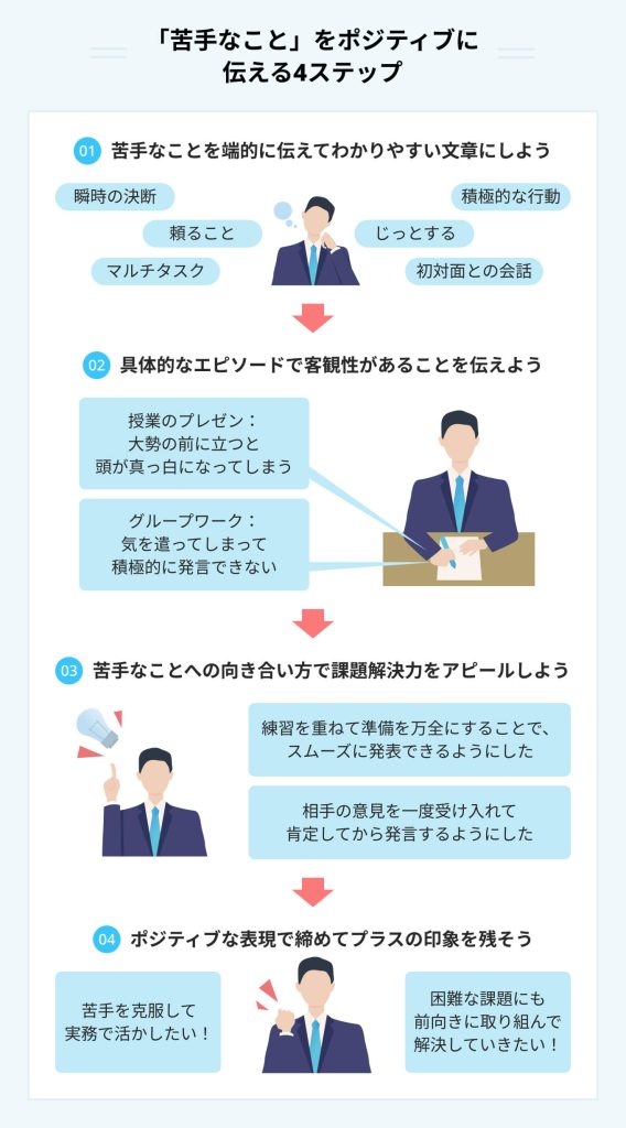 面接で「苦手なタイプ」を聞かれた場合、否定的な言葉遣いを避けることが大切です。否定的な言葉は、相手に不快感を与え、印象を悪くする可能性があります。たとえば、「私は〇〇な人が苦手です」と答えるのではなく、「私は〇〇な点に注意を払うようにしています」とポジティブな表現に変えることで、好印象を与えることができます。また、自己改善の姿勢を示すことも重要です。苦手なタイプを認めた上で、どう改善していくかを述べることで、前向きな姿勢を示すことができます。具体的には、「私は細かい作業が苦手ですが、チームワークを活かして改善していきたいと思います」といった回答が考えられます。