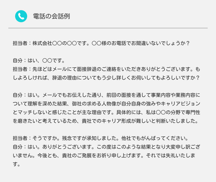 電話での会話では、最初に自分の名前と連絡先を伝え、面接辞退の意向を明確にします。感謝の気持ちを伝えることも忘れずに、「面接の機会をいただき、ありがとうございました」などと述べることが良いでしょう。また、辞退理由を簡潔に述べることも大切ですが、否定的な表現は避けるべきです。例えば、「他社からのオファーがあったため」など、肯定的な理由を述べるようにします。