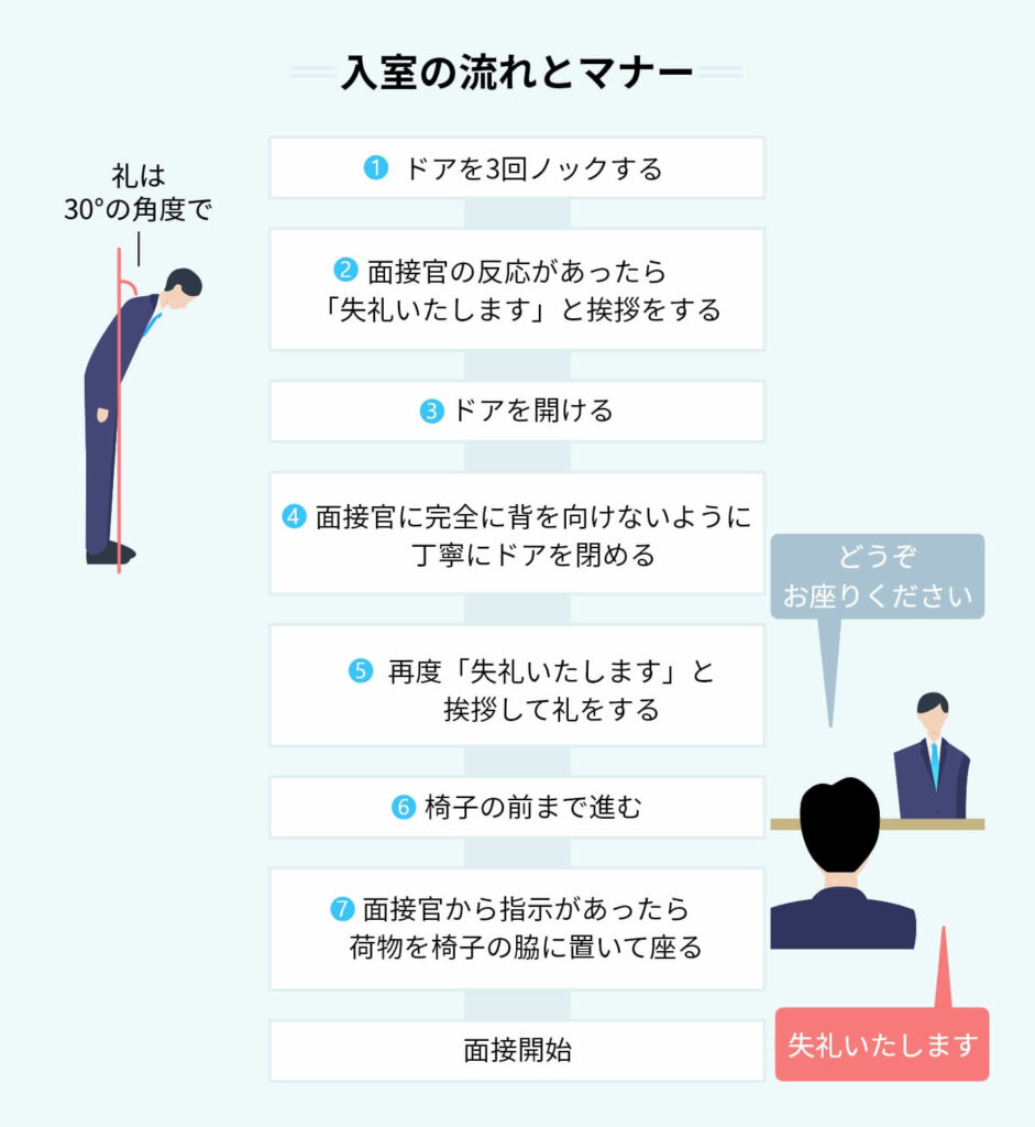 その後、面接官が来たら、丁寧に頭を下げ、「○○(面接官の名前)様、お世話になります」と言って挨拶します。面接官の名前がわからない場合は、「お世話になります」とだけ言っても構いませんが、事前に調べるなどして、名前を知っておくことが望ましいです。また、姿勢にも注意し、背筋を伸ばして立ったり座ったりすることで、プロフェッショナルな印象を与えることができます。